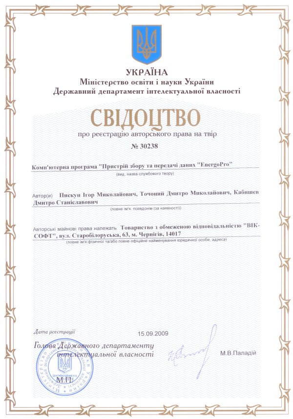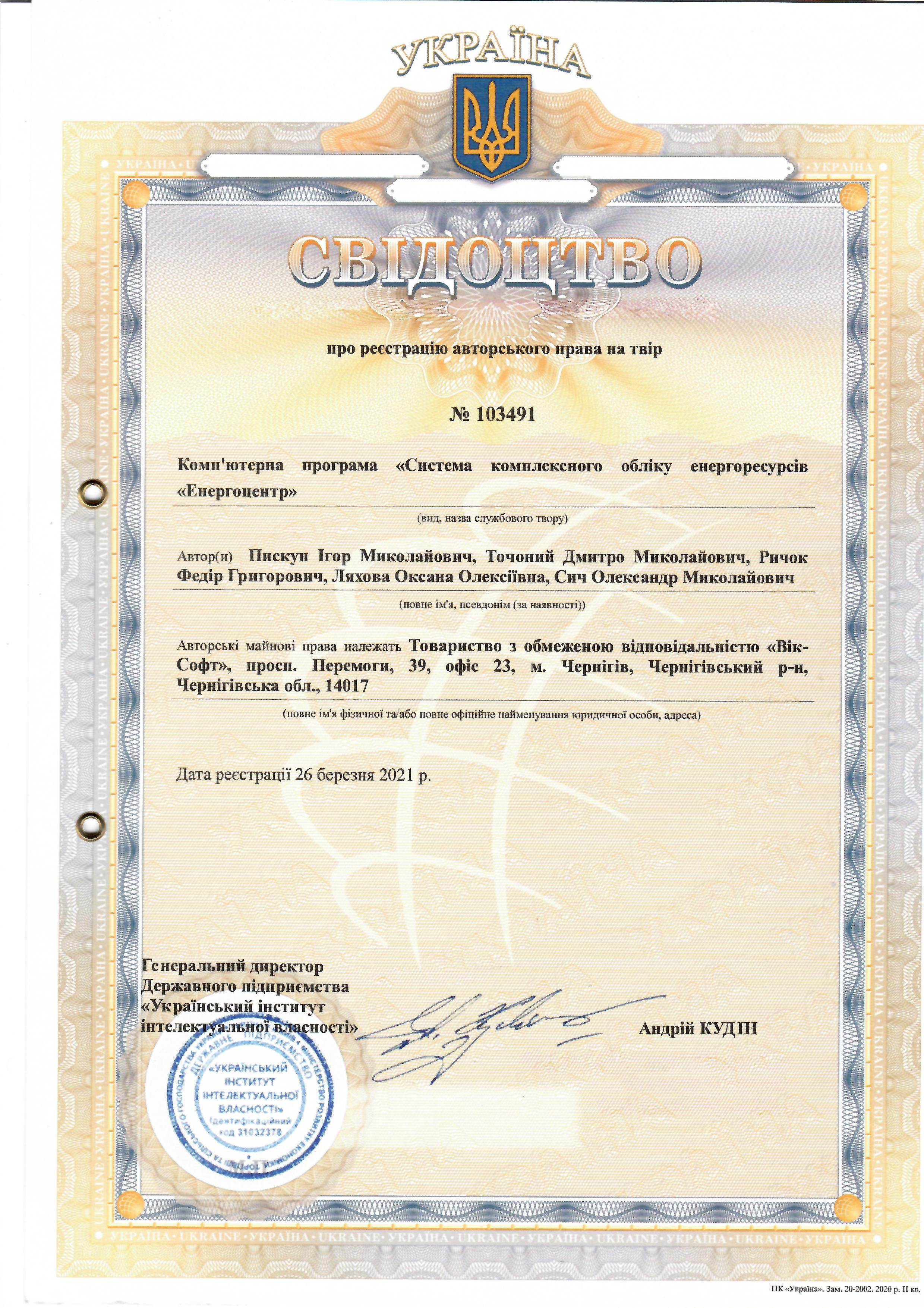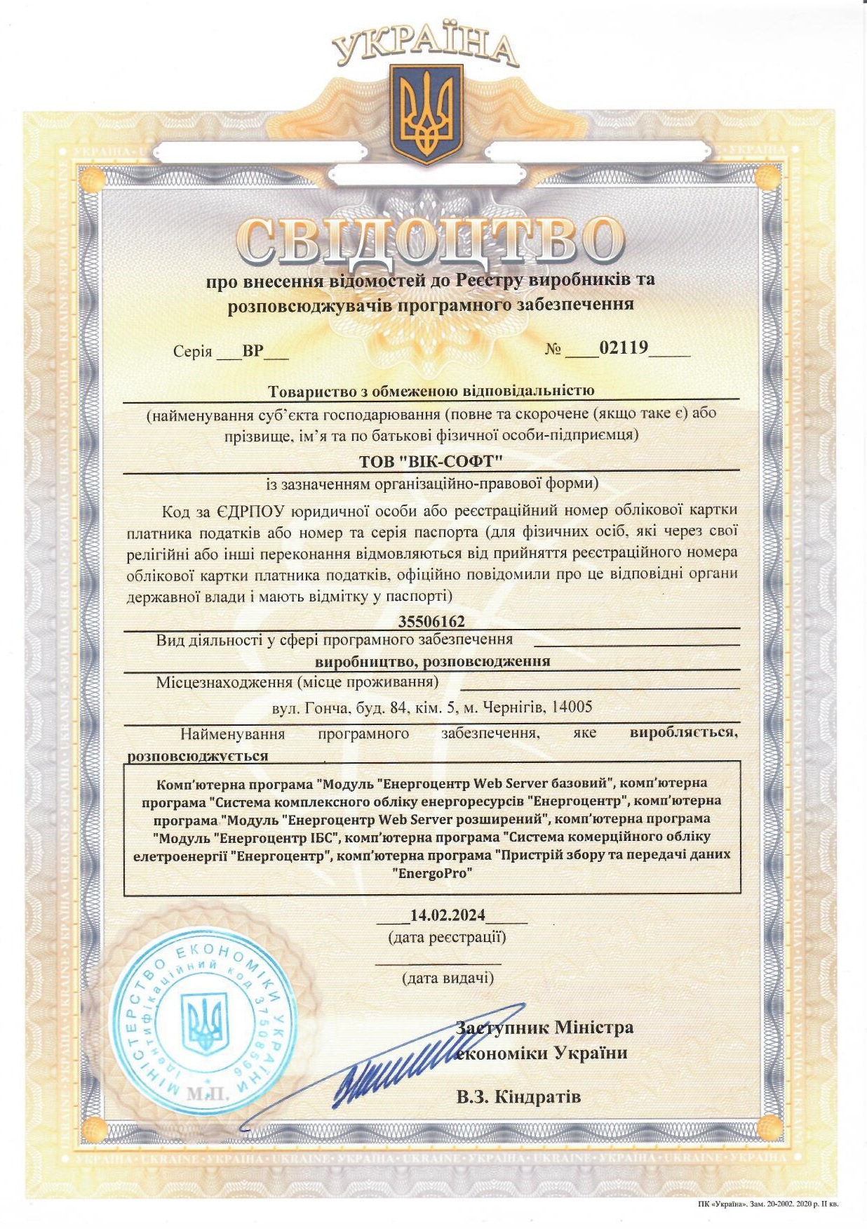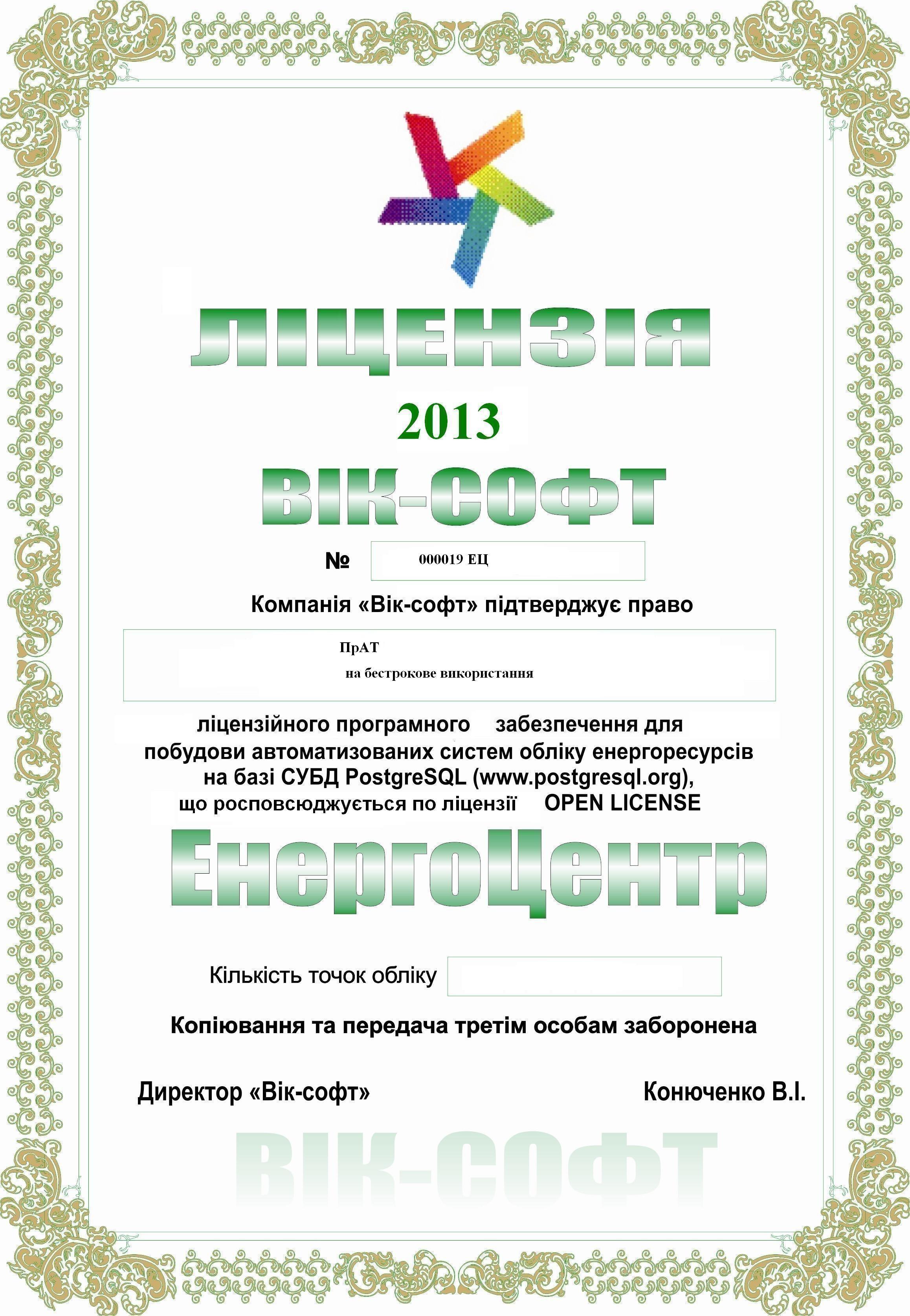 Свідоцтво авторських прав на ПЗ "ЕнергоЦентр" Свідоцтво про внесення фірми в реєстр виробників і розповсюджувачів програмного забеспечення. Це Свідоцтво надає право виробництва та розповсюдження ПЗ "ЕнергоЦентр компанією ТОВ Вік-Софт. ![]() Приклад ЛіЦЕНЗії, що видається кінцевому користувачу Ліцензійні дані на СУБД PostgreSQL (розповсюджується по Open License) - https://www.postgresql.org/about/licence/ |